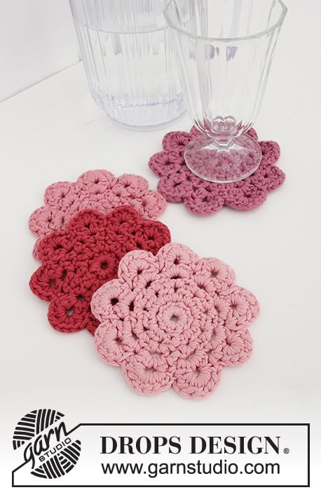 This festive set includes 10 unique round crochet coasters, each featuring a different stitch pattern worked from the center outwards using DROPS Cotton Light yarn.