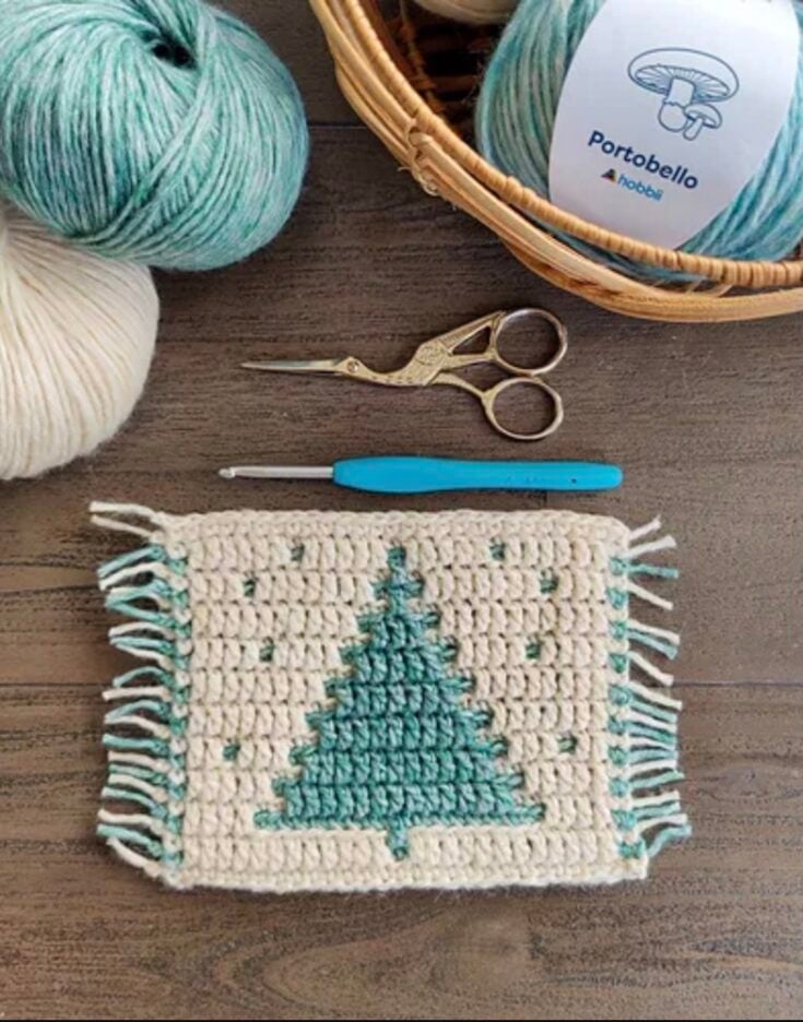 This festive coaster uses the overlay mosaic crochet technique to create a charming Christmas tree design, perfect for holiday decor.