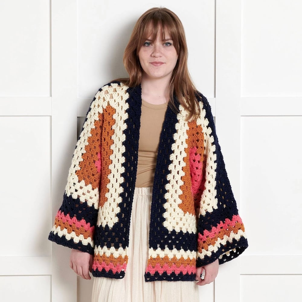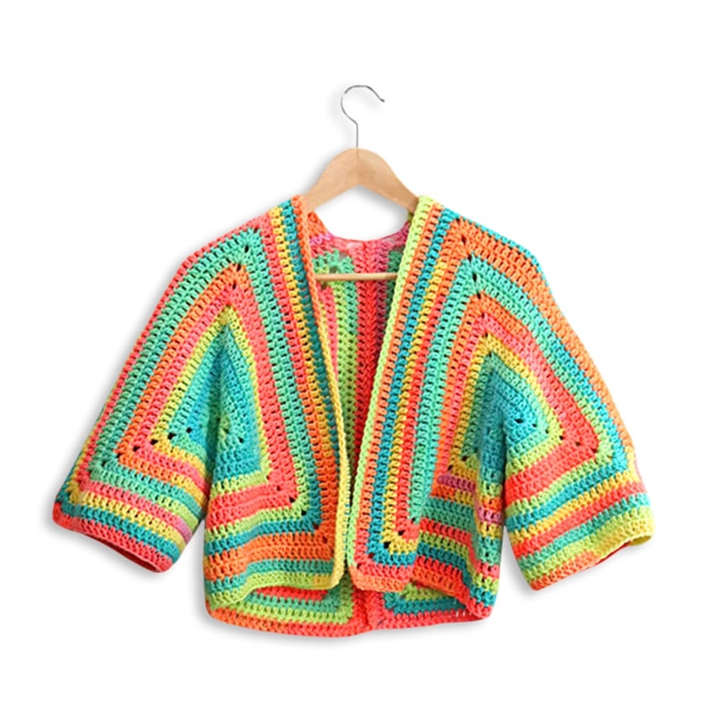 A vibrant layering piece made from two oversized granny-style hexagons joined into a wearable sweater.