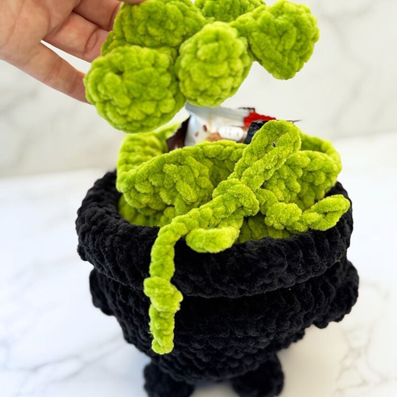 A cozy little crochet cauldron for Halloween treats, tabletop décor, or spooky storage!