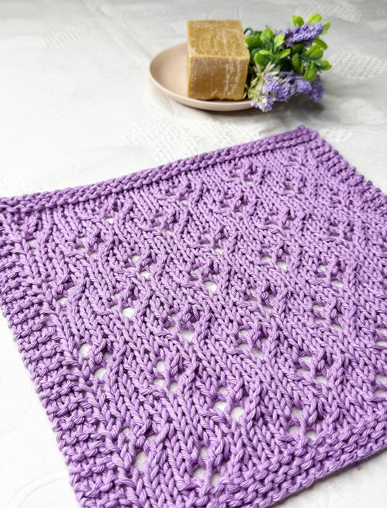 Sweet Violets is knit in Lilac cotton and features a flowing lace texture with a gentle floral feel, pretty on the counter, but still practical for everyday use.